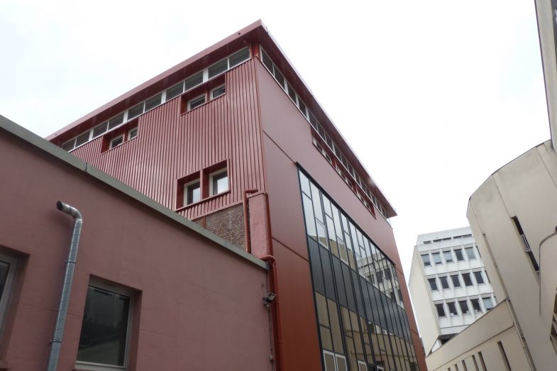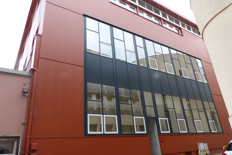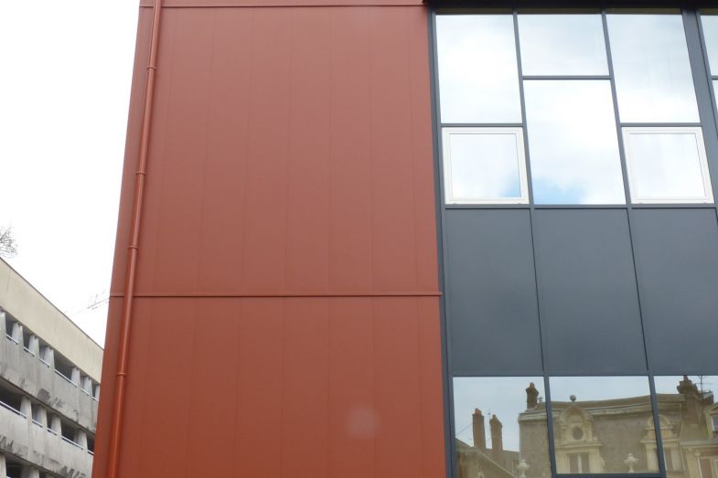 La solution choisie est une pose en vêtage, panneaux M32 sur l'ensemble de la surface, avec pour finition un aspect lisse RAL 8004.