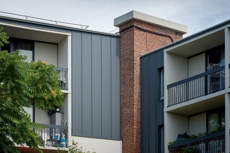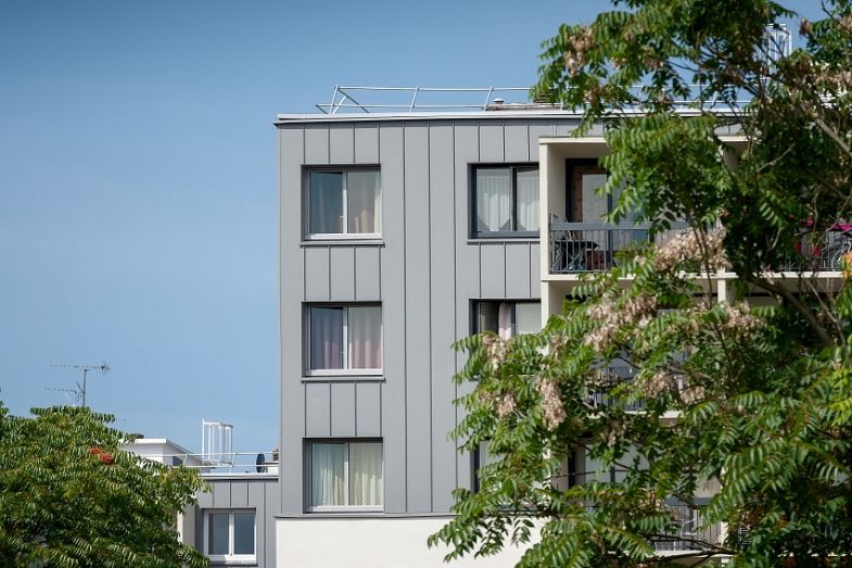 Solution mise en œuvre : Parement M32 en pose « façon joint debout » en vétage sur 1er lit d’isolant polyuréthane de 60 mm.